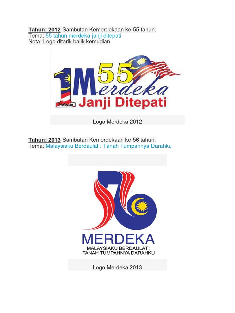Jika dibaca melalui kenyataan akhbar menteri penerangan komunikasi dan kebudayaan datuk seri dr rais yatim pada 29 julai 2012 beliau menjelaskan tiada logo rasmi digunakan bagi sambutan hari kemerdekaan ke 55 tahun ini melainkan logo 1malaysia sepertimana sambutan pada tahun lepas. Koleksi tema dan logo hari kemerdekaan hari kebangsaan malaysia disambut di seluruh negeri pada setiap 31 ogos setiap tahun bagi menandakan negara bebas daripada belenggu penjajahan sejak 1782 sehingga tahun 1957 hari kebangsaan merupakan peristiwa utama dan disambut secara besar besaran dengan mengadakan perarakan warna warni nyanyian pertunjukan pentas pertandingan dan pelbagai lagi. Skrang dah heboh satu dunia 1malasia yang logo merdeka tahun ini sngat kreatif kreatif lah sangat.